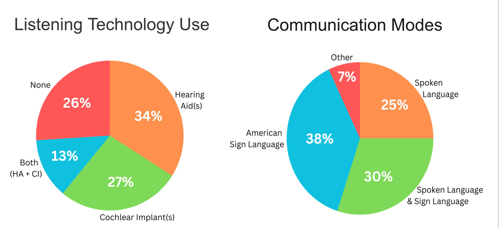 You can see how diverse our student body is, not only in terms of communication modes but also in listening technology use. Twenty-five percent of our students use spoken language to communicate, while 38% use American Sign Language. Thirty percent use a combination of spoken language and sign language, and 7% use other communication modes.