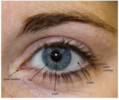 Humans typically have two eyes of equal size. The iris (colored part of the eye) surrounds a dark central pupil. This pupil normally fluctuates in size, becoming larger in dim light, and smaller in bright light. The sclera, or surface of the eyeball is normally white. The corners of the eye are called canthi. The inner canthus is closest to the nasal bridge, and the outer canthus is closest to the outer ear. The upper and lower eyelids each contain a complete row of eyelashes, and the space between the lids is called the palpebral fissure. The appearance of the palpebral fissures provides a starting place for examining the external eye.