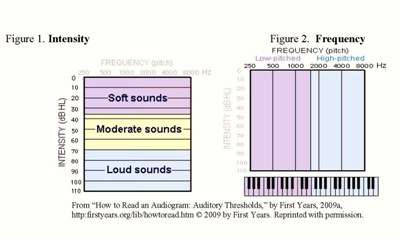 To determine the degree of an individual's hearing loss, an audiologist will measure a person's hearing threshold, or the softest sounds a person hears at different frequencies (pitches) about 50% of the time. Intensity (loudness) is measured in decibels (dB) and frequency (high/low pitch) is measured in Hertz (Hz). Figures 1 and 2 illustrate how intensity and frequency relate to hearing. Plotted on a graph called an audiogram, intensity is on the vertical axis of the graph and frequency across the top.