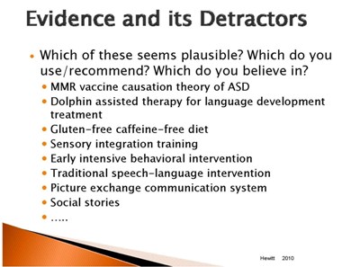 How many of you have heard of dolphin assisted therapy?  Some of you have heard of dolphin therapy.  Some folks haven't heard of it.  How many think that it is a plausible treatment for language development in autism?  Most people are putting thumbs down on this.  It seems like the majority of voters here are feeling that dolphin therapy, in and of itself, may have some benefit or may not, but perhaps is not an appropriate treatment for language development.  There's other things on this list that are obviously a lot more near and dear to our hearts and more likely to be engaged in by more speech language pathologists, such as our traditional approaches that we have used for language development in other populations: Picture Exchange Communication System, Social Stories.  We're going to talk a little bit about some of those today.