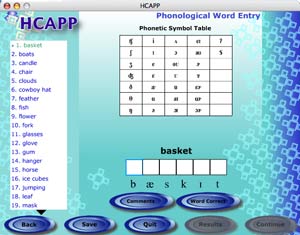 Barbara: HCAPP is a software program that helps speech-language pathologists analyze children's disordered phonological systems. Once the productions of the 50 HAPP-3 words have been elicited, transcribed, and verified, they can be entered into the HCAPP software.