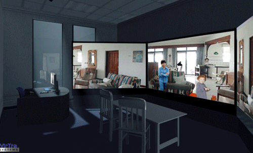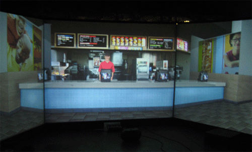 Williams::Well, some people refer to the space we've created as a "cave." I don't like that term as it has negative associations with it, but I think it as an interactive virtual reality theater. It's more of an open environment, like a small movie theater with three screens covering about 180 degrees using "surround screens." We could expand to 360 degrees, but it seems like 180 is fine and we'll start with that. Then when the user enters the room, the movies are initiated, and the user and the movies actually speak to each other. They share spoken discourse within a common visual scene that relates to a particular situation, such as ordering food in a restaurant, or whatever exercise and scenario are appropriate for the given end-user.
